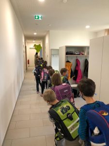 Endlich ist es am Freitag, 20.11.2020 soweit: Wir ziehen ins neue Schulhaus. Nachdem zwar in den Herbstferien die Lehrkräfte mit Hilfe unseres tollen Hausmeisters Herrn Homeier (ohne ihn wäre es nicht gegangen!!!! Danke dir!) schon viele Kisten „rüber“ gebracht haben und auch schon einiges eingeräumt wurde, durften nun aber endlich die Hauptpersonen einziehen: unsere Schülerinnen und Schüler.